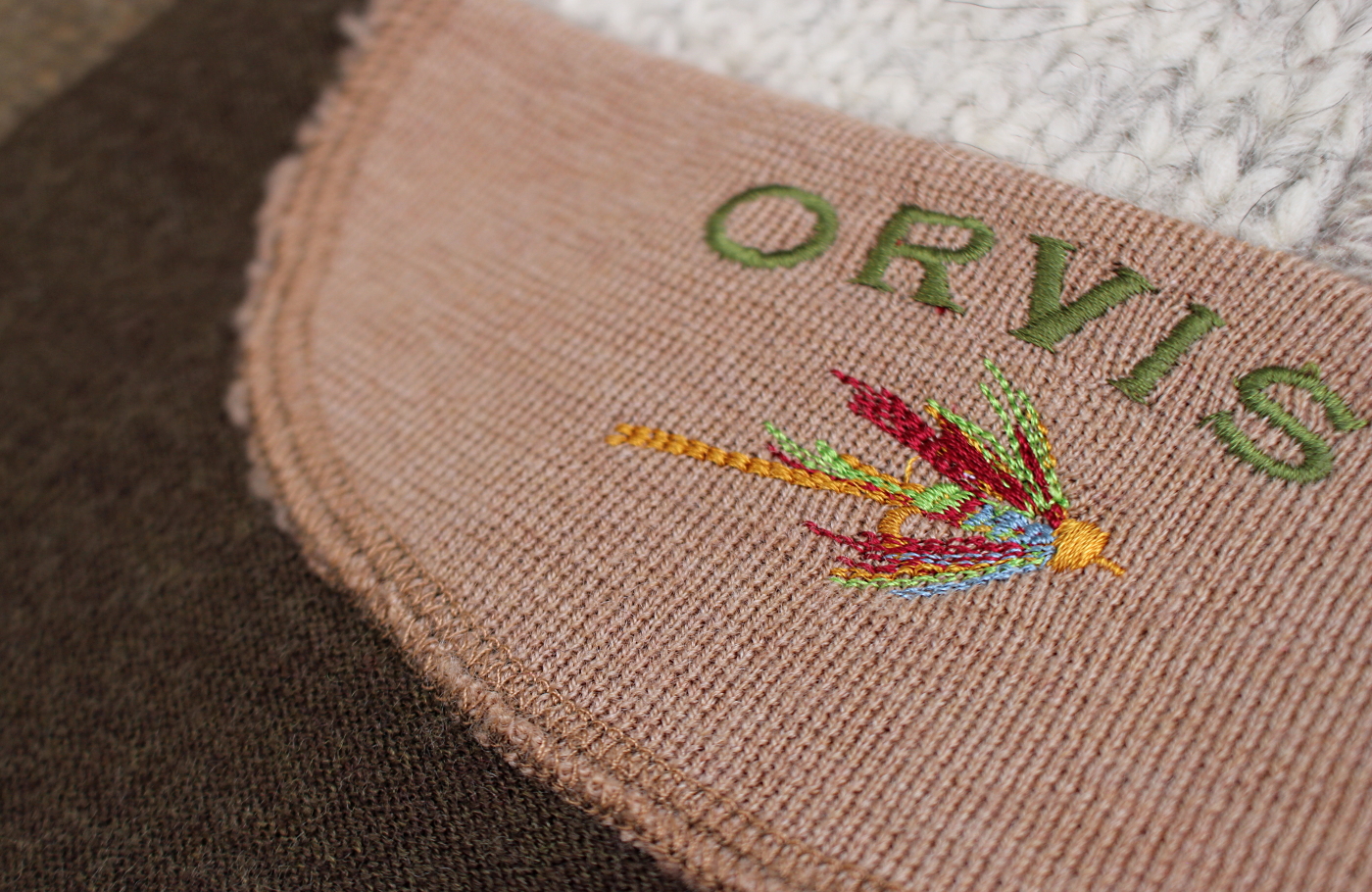 Mike had three half-zip sweaters by Orvis, two with large, wildly colorful brand labels inside the sweaters’ necklines. At first glance I thought they were mosquitoes (!) but then realized they’re fishing flies. So much better! I wouldn’t do well with a mosquito inside my shirt.