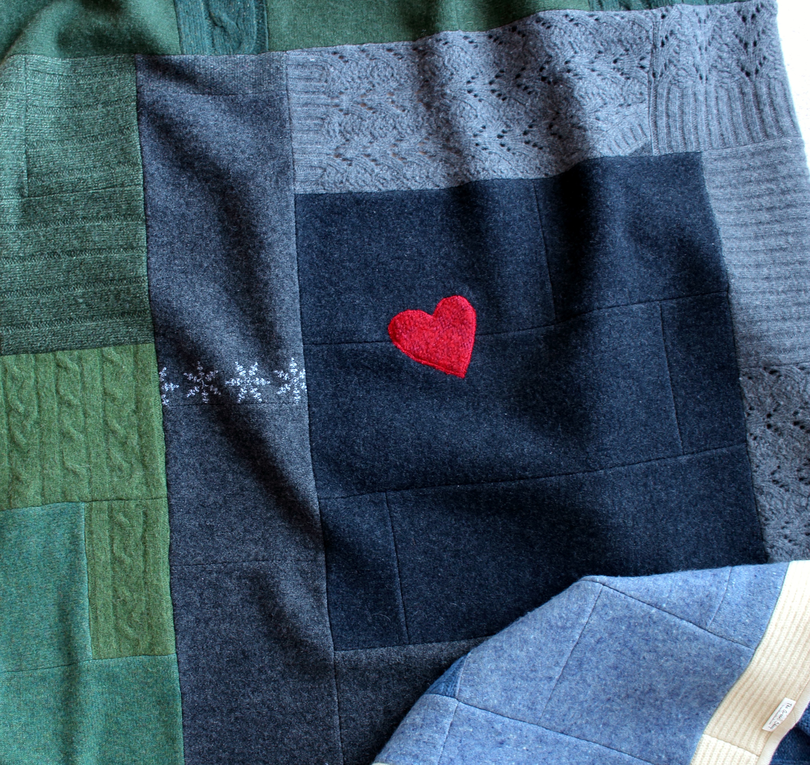 (For readers, here are some fun blanket details: The colorful sweaters belonged to Anne–the green, the blue, the mottled blue and the multicolored one. The buttons are from the green sweater, and I included two pockets of the mottled blue. In the end, Lori chose three yellow roses for the three grandsons whom “Mom thought the world of and who felt the same about her.” Finally, the bumpy tan under the roses with its braid pattern was difficult to sew over but I love the contrast it offers. As my husband pointed out, “It looks like brambles behind the roses” — those rough patches in marriage and in life that make the sweet part even sweeter.)