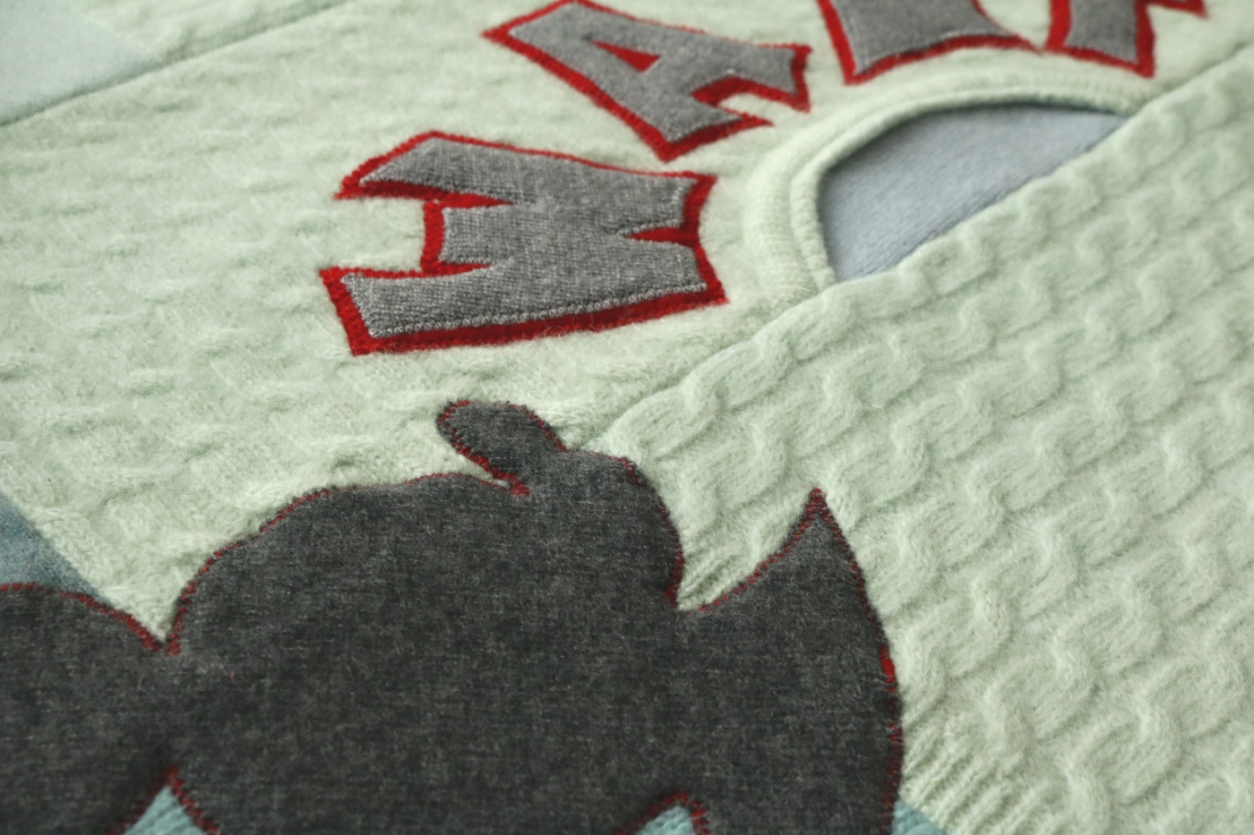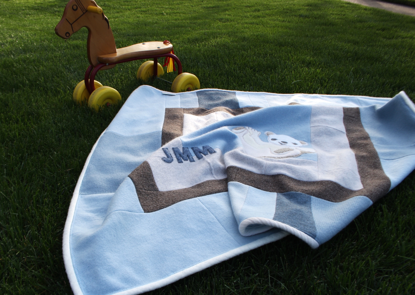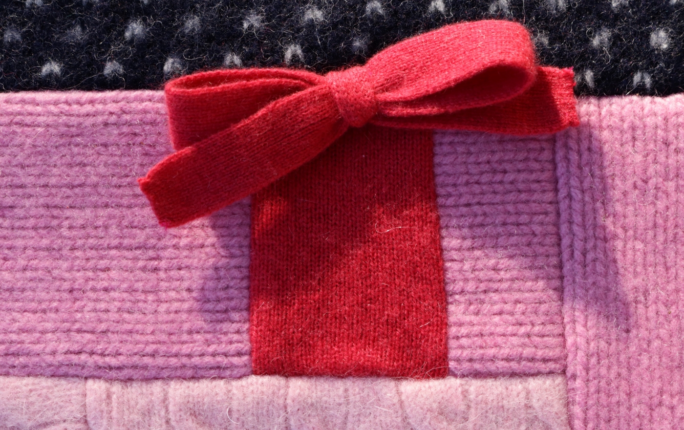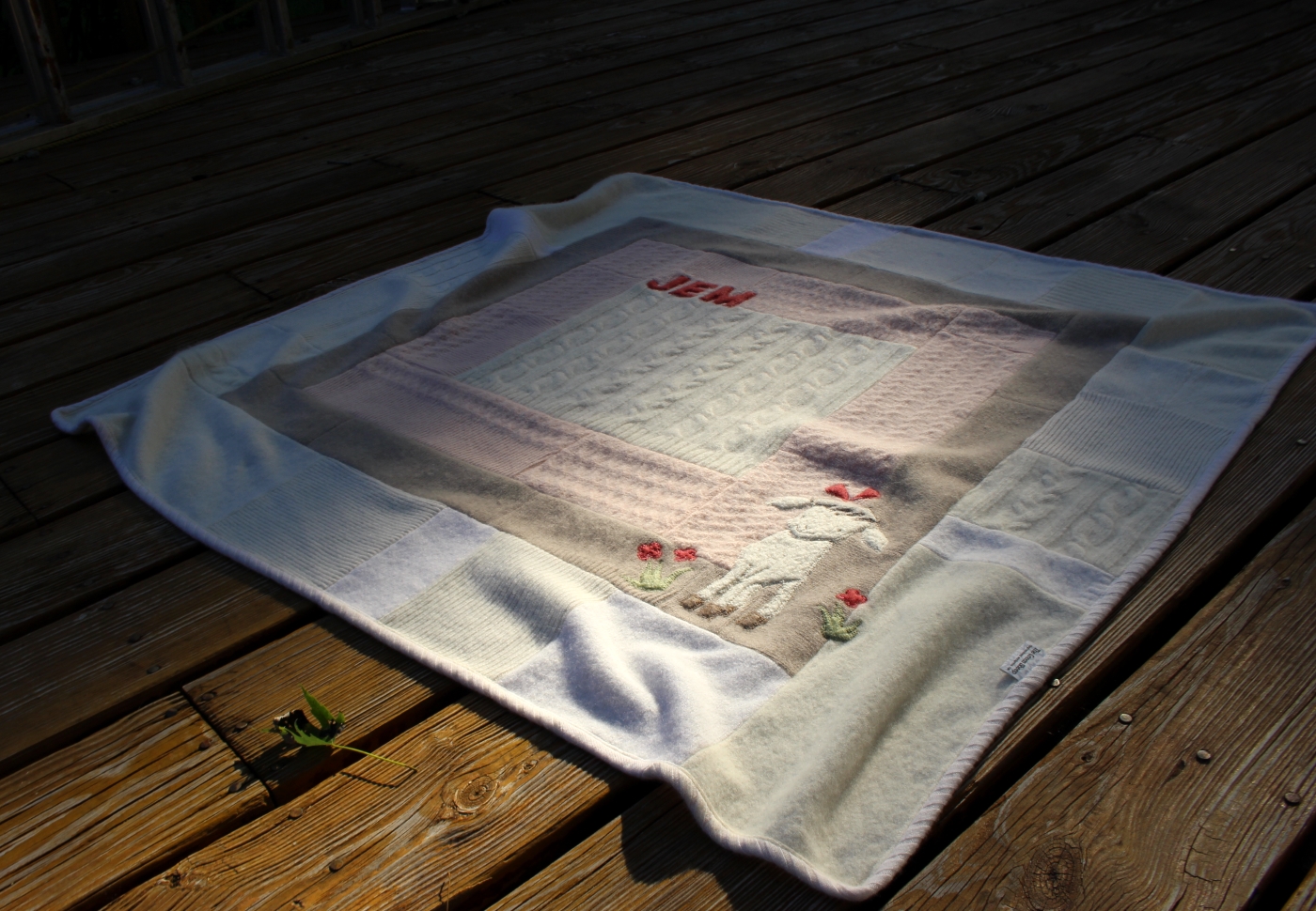 * several small sweater pieces stitched on top of the blanket’s border for greater texture