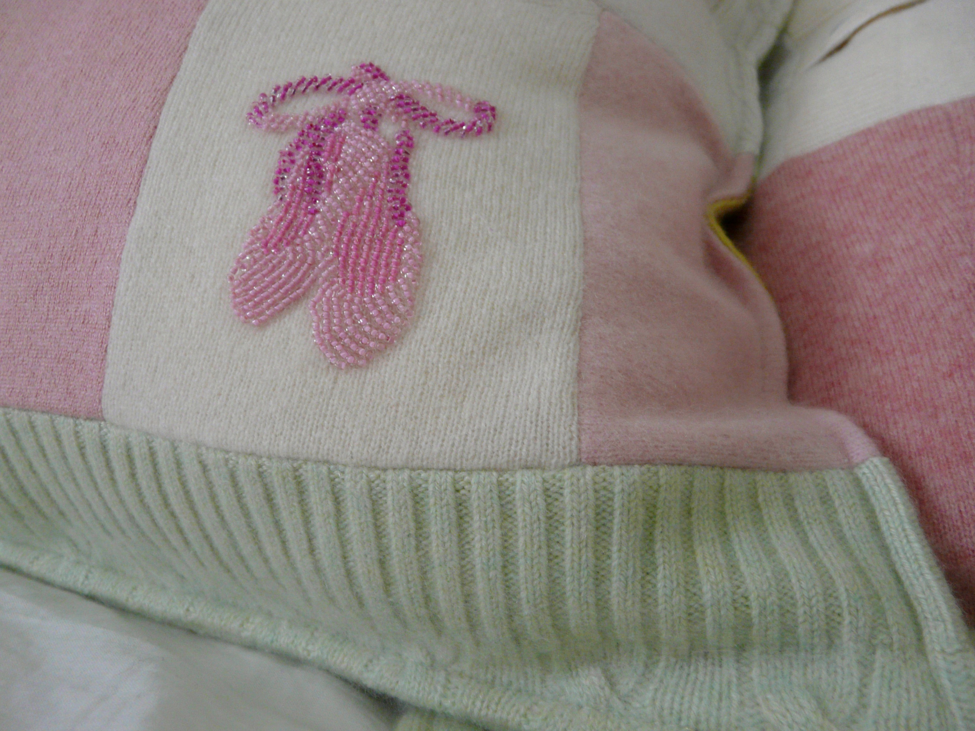 Anyway, to me, the cream-colored squares in the blanket are like two windows, letting in wan but welcome light. Up close, you can see scrabbling vines “outside.”