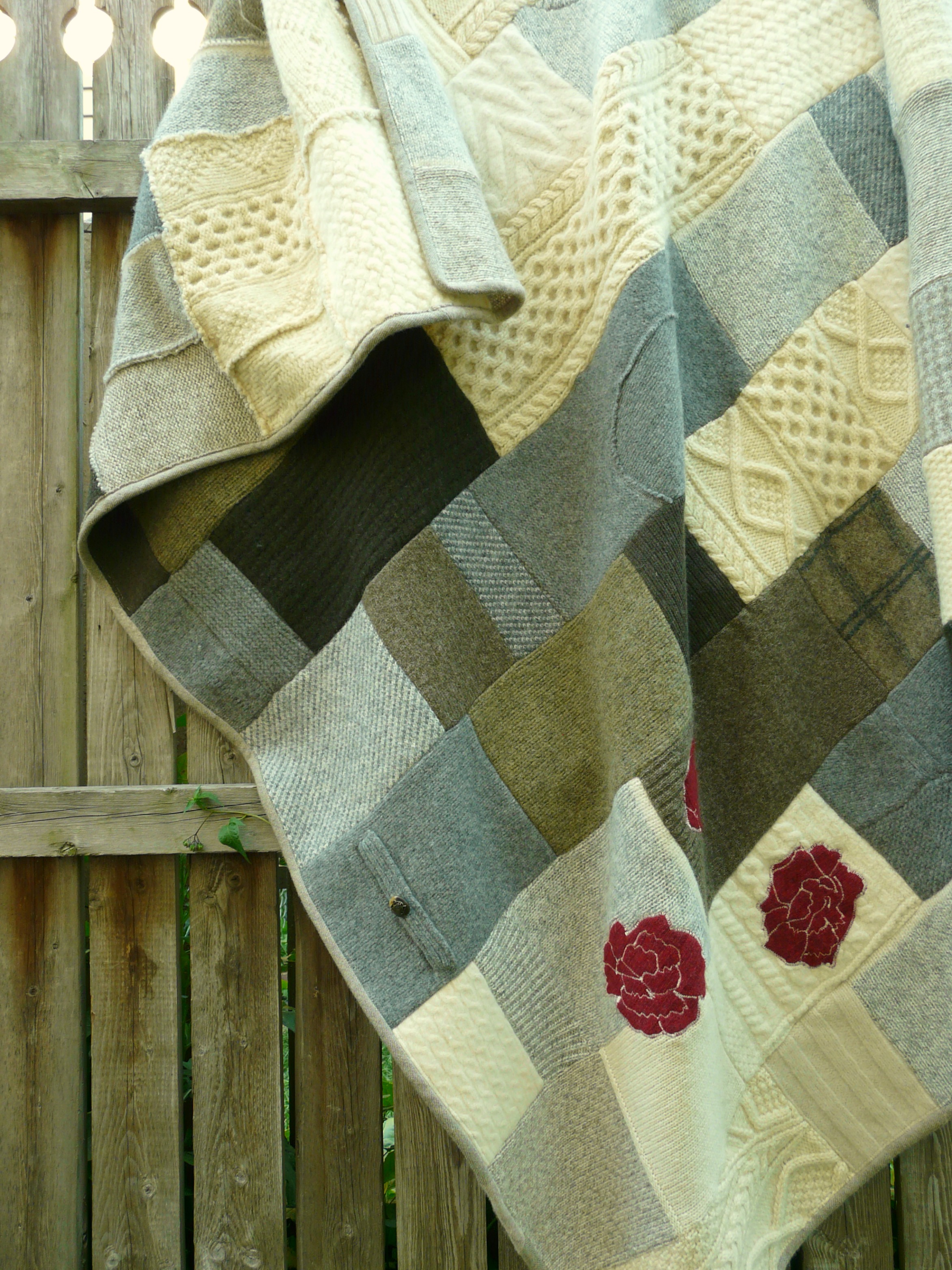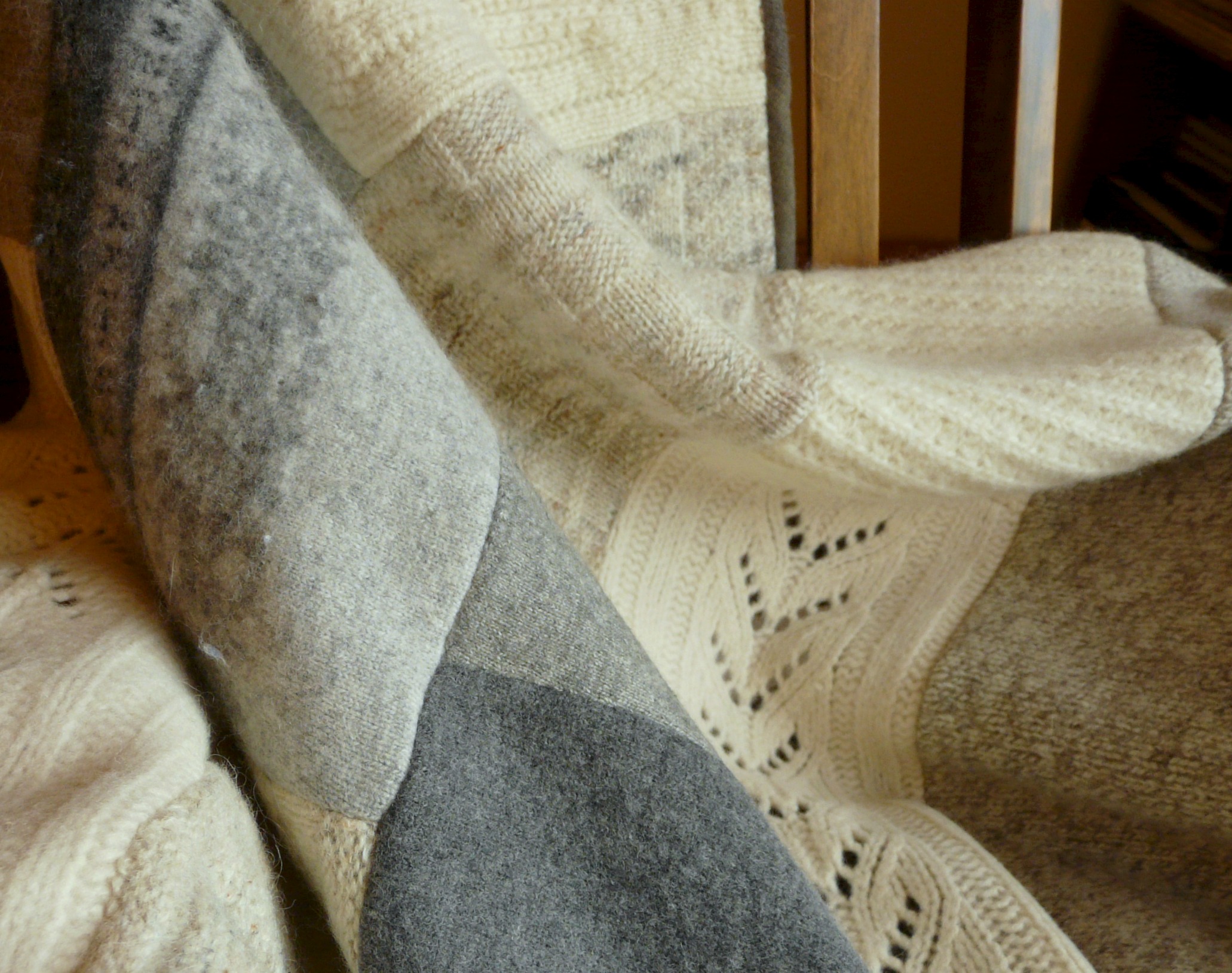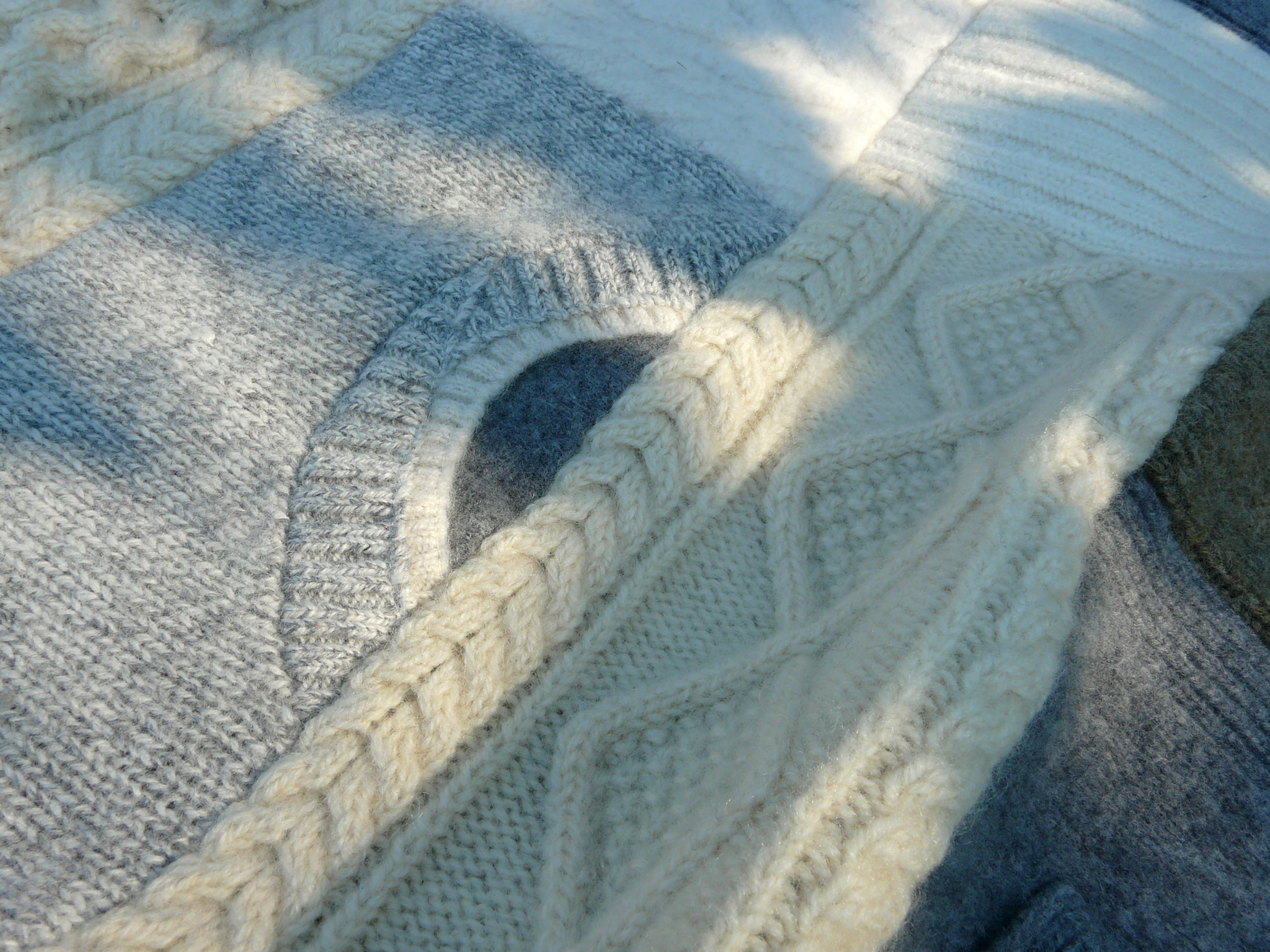 Mariclare’s family contributed a lovely cream-colored Irish afghan of hers for the blankets. That beautiful afghan shrunk to a very small size, causing me to cut its knitted cable and basket-weave stitches into long strips rather than the rectangles I usually employ for blankets. I added in a Celtic-design sweater I’ve been saving, with chains of Celtic knots, to tie the trio together as well.