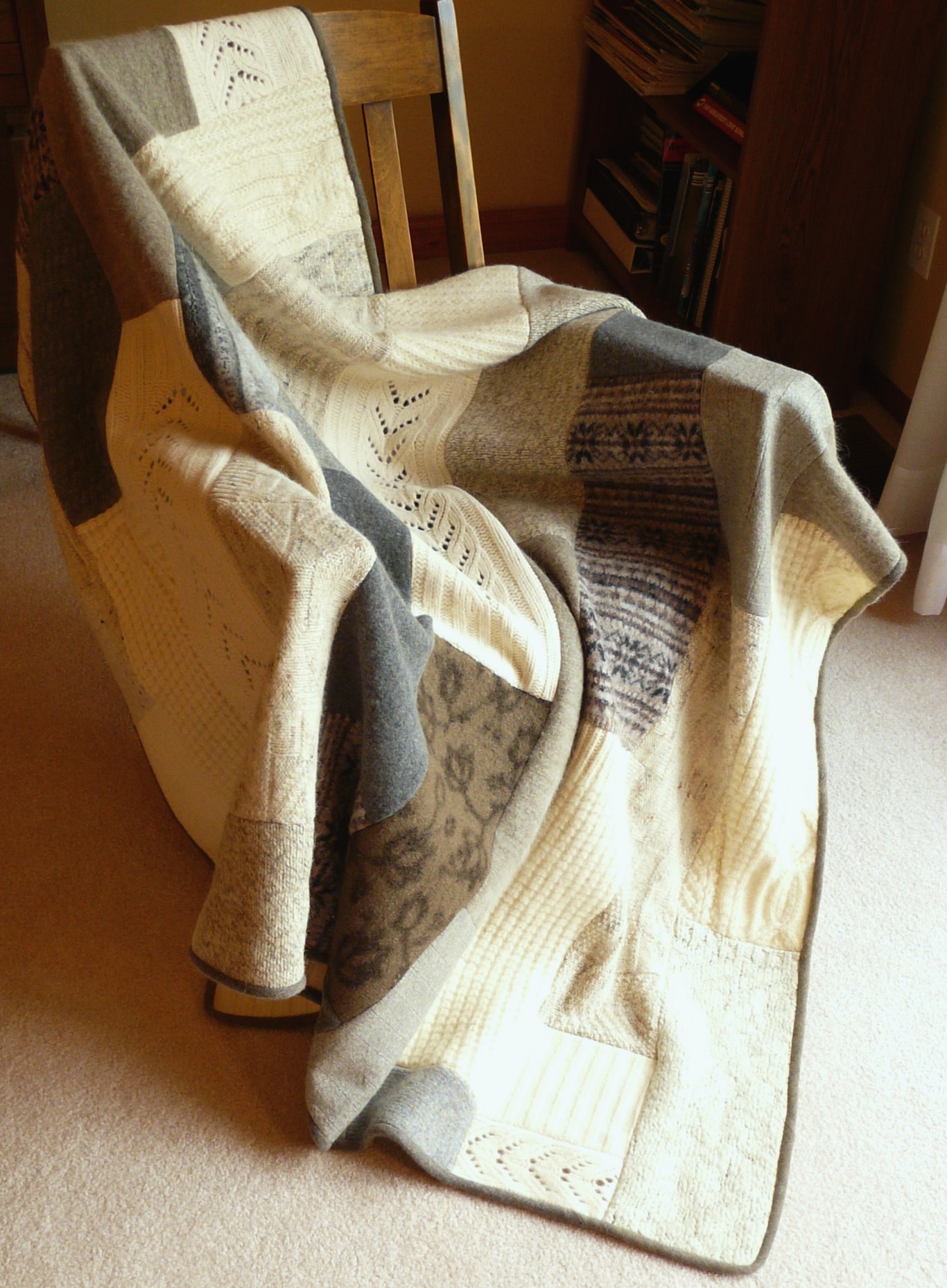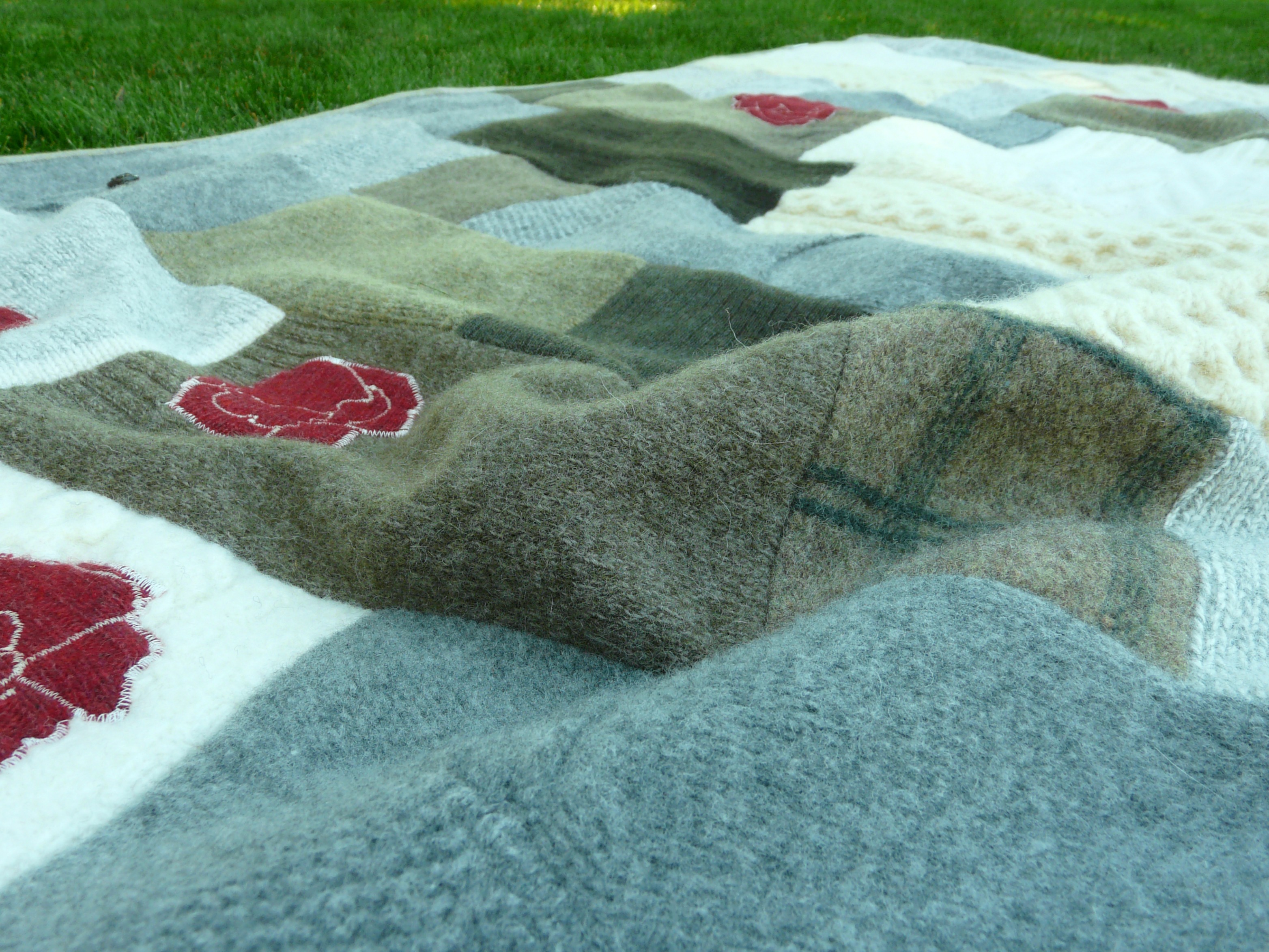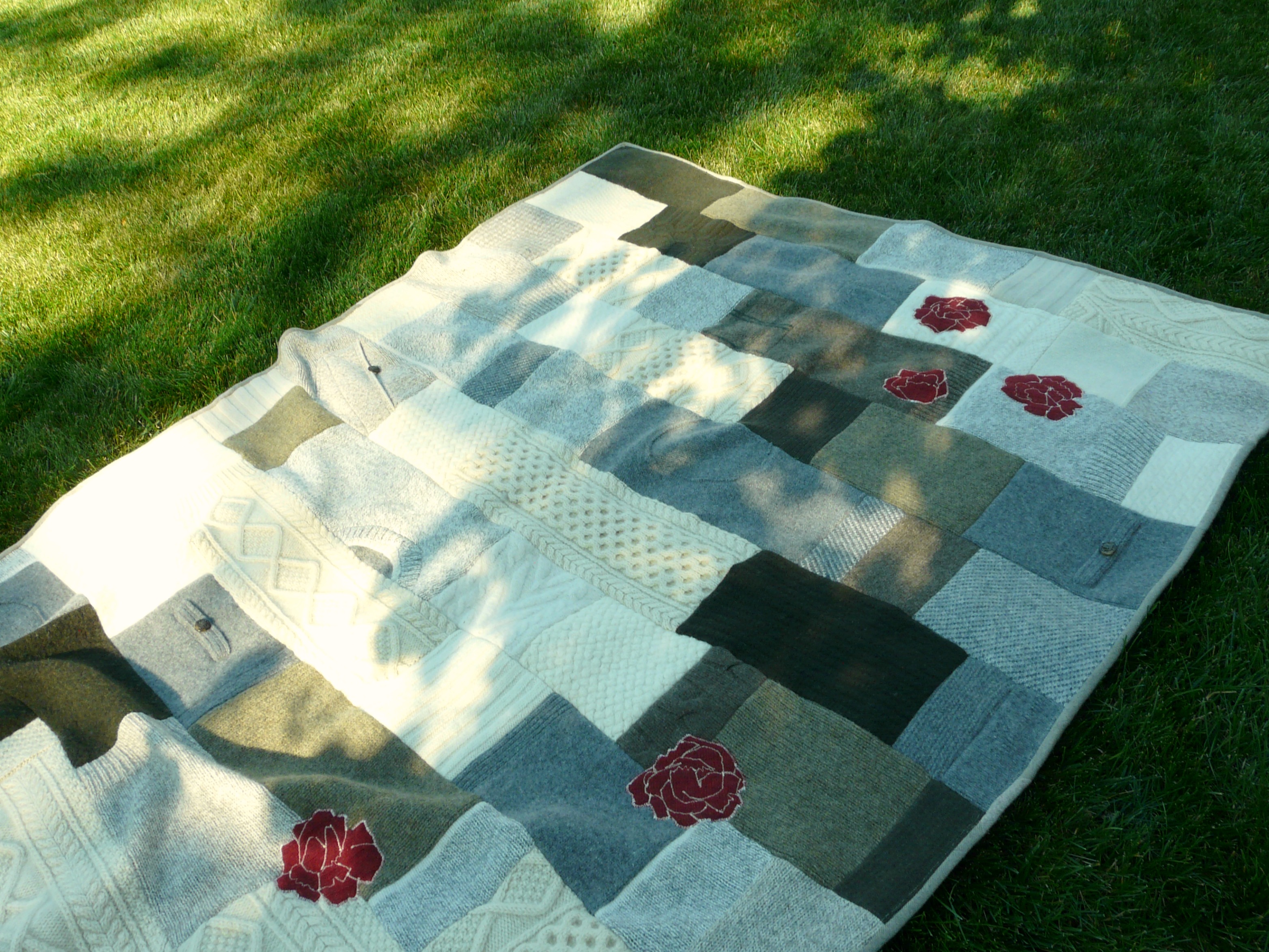 Mariclare’s family contributed a lovely cream-colored Irish afghan of hers for the blankets. That beautiful afghan shrunk to a very small size, causing me to cut its knitted cable and basket-weave stitches into long strips rather than the rectangles I usually employ for blankets. I added in a Celtic-design sweater I’ve been saving, with chains of Celtic knots, to tie the trio together as well.